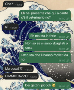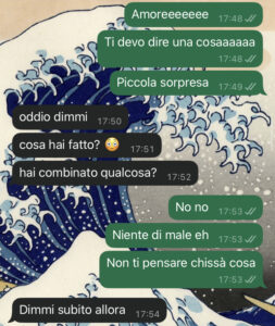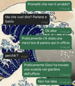 Non vi dico ancora cosa ho fatto, perché altrimenti vi rovino la sorpresa…. Non so se ridere o piangere. Vi dico solo che c’entra una “cosa piccola” trovata nel giardino dell’ufficio in cui lavoro, un gesto di buon cuore e… la sua reazione che è stata da film horror!! Vi lascio leggere la chat, perché a parole non riuscirei mai a rendere la scenata che mi ha fatto.