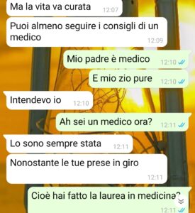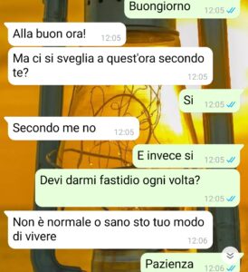 “Salve a tutti cari lettori di Spunteblu, il mio nome è Damiano e penso di aver beccato una delle peggiori pazze che potessi avere la sfortuna di trovare in tutta la vita. Voleva controllare la mia vita e non come fanno tante persone in una relazione, tramite la gelosia o cose del genere. No, magari perché mi avrebbe dato meno fastidio. Lei ha superato il mio limite di sopportazione, ma non vi anticipo per che cosa. Dovete sapere che questa persona l’ho conosciuta su una delle tantissime app di incontri che ci sono e ho pensato che potesse andare tutto bene tra noi. Mi sembrava cordiale, molto impegnata con il suo lavoro e capace di intraprendere una relazione sana in cui si da tanto spazio all’ascolto, ai sentimenti altrui eccetera eccetera. Il problema si è venuto a creare quando mi ha detto il suo lavoro e ciò che lei era convinta che io dovessi fare per migliorare la mia vita. Il mio di lavoro è uno che mi porta ad alzarmi di notte per lavorare in notturna e, sarà strano, ma io amo ciò che faccio e non lo cambierei per nulla al mondo, ma lei in particolare cercava di curarmi, come se ci fosse stato qualcosa da curare.”
