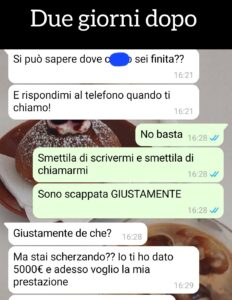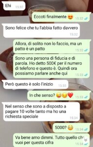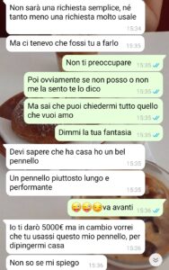 “Mi presento: mi chiamo Veronica, ho 27 anni e di mestiere faccio l’onlyfanser, ovvero creo e vendo miei contenuti su internet. E qui già mi aspetto le peggio critiche: “sei una scansafatiche, il tuo non è un vero lavoro, vendi il tuo corpo sei solo una…” e mi fermo qui insomma. Spero proprio che questo non accada e che si abbia la lucidità di valutare la situazione per quello che è. Che se ne dica, il mio è un lavoro vero a tutti gli effetti. Mi sveglio al mattino e devo girare e poi editare al computer tutti i miei contenuti, nel pomeriggio devo programmare la giornata seguente e occuparmi di aspetti burocratici (perché sì, pago le tasse e anche tante) e alla sera interagire con i clienti, spesso fino a tarda notte (e comunque lo faccio h24 questo). Poco tempo fa però mi sono imbattuto in un certo Franco. Un uomo viscido che mi ha trattata molto male e quello che ha fatto, oltre ad essere moralmente molto sbagliato, è anche illegale. Purtroppo la situazione non è finita bene ma ho deciso di condividere questa mia conversazione per sensibilizzare sul tema. Perché spesso la vittima non è chi dice di esserlo.”