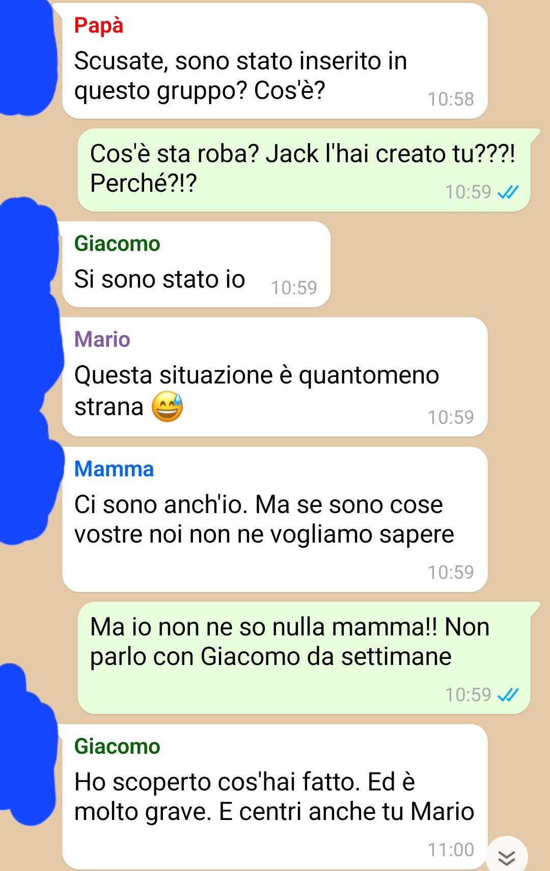 “Anche se sono piuttosto giovane, la mia vita sta per essere cambiata per sempre da un evento che appunto mi accompagnerà per il resto dei miei giorni. Un evento positivo, che però è stato rovinato, come sempre, dal mio ex fidanzato Giacomo…ma andiamo con ordine. Sono stato fidanzato con Giacomo per tanti anni e non posso negare che ci siamo amati. Il nostro era un fidanzamento a tutti gli effetti, lui era sempre da me, abbiamo anche pensato di sposarci ma poi, è tutto finito. Lui è diventato sempre più appiccicoso, poi avevamo aspirazioni diverse, e ci siamo lasciati. Succede. Non lo odio, però si è comportato male con me. Detto questo, era finita. Quasi subito mi sono messo con un altro ragazzo, Mario, con cui ero stata circa un anno prima di stare con Giacomo, e stavolta è stato amore a prima vista e già dopo pochi mesi di relazione, leggerete presto il perché, la nostra vita stava già per cambiare in meglio. Purtroppo, però, Giacomo si è inserito prepotentemente, probabilmente perché non accettava la situazione, ed ha creato un gruppo con me, lui, Mario e pure i miei genitori, per farci una rivelazione, a suo dire, sconvolgente.”