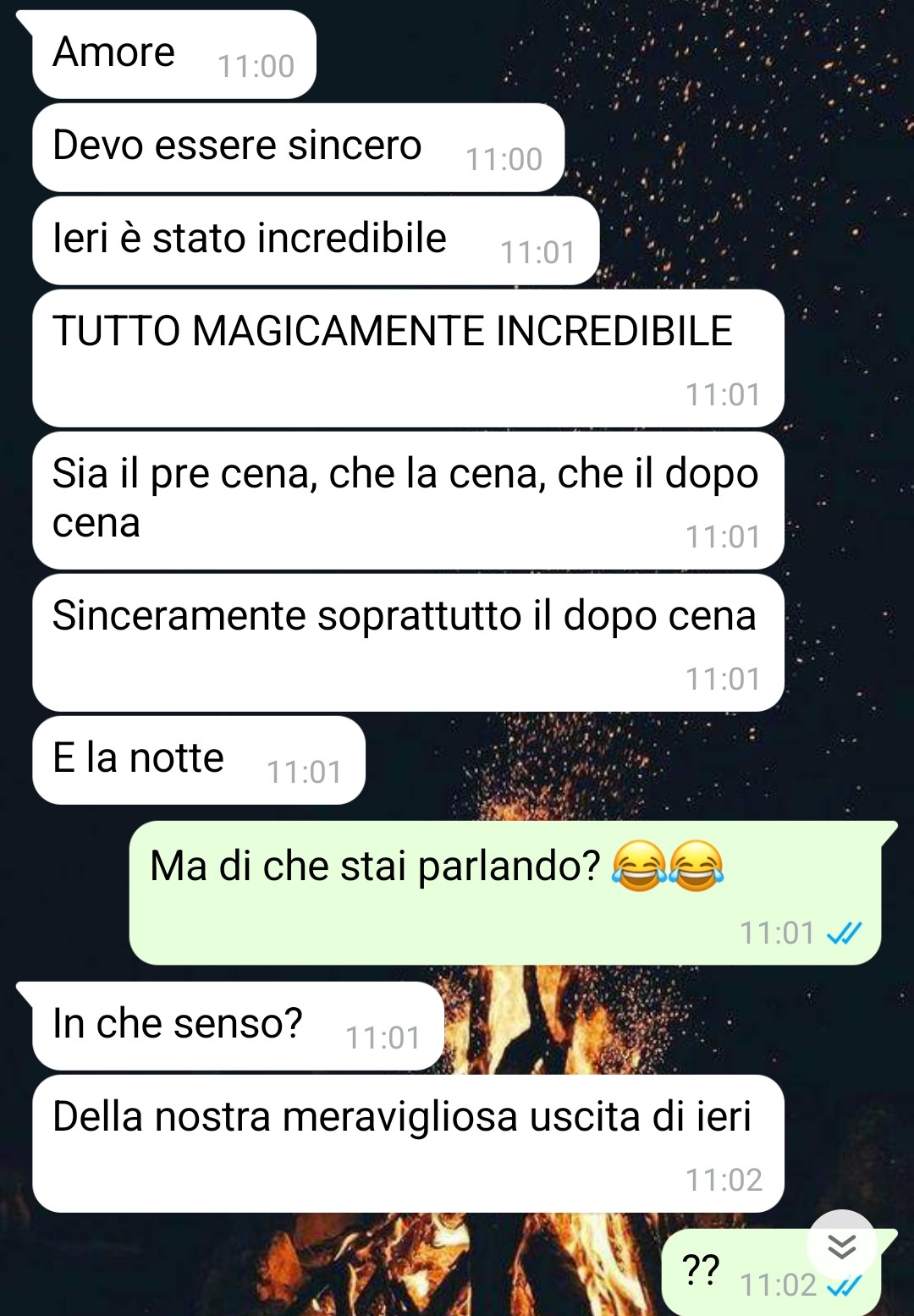 “Sono sconvolta, veramente sconvolta, non ho altro da dire in questo momento. So che forse, magari non in molti, qualcuno potrebbe ritrovarsi nella mia stessa situazione, quindi tutelatevi, vi dico solo questo. Tutelatevi da situazioni terribili come quella che ho vissuto. Tutto è iniziato in un giorno come un altro. Io sono fidanzata con Alessio da circa due anni e stiamo molto bene insieme. Usciamo, ci divertiamo, siamo molto amici prima che amanti ma sicuramente la nostra relazione va molto bene anche dal punto di vista intimo. Ci piace anche, come spesso capita tra le coppie, di scherzare tra noi, magari prendendoci romanticamente in giro per stuzzicarci un po’. E questo stava accadendo anche l’altro giorno. Stavamo parlando via WhatsApp e, dal nulla, lui mi comincia a parlare della meravigliosa serata che a suo dire avevamo passato il giorno prima. Un modo per farmi una qualche proposta? Può essere, mi sono detta. Ma appunto siamo soliti giocare così tra di noi, quindi gli ho dato corda e l’ho invitato a raccontarmi questa meravigliosa serata che avevamo passato. Non l’avessi mai fatto…”