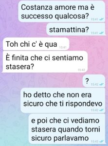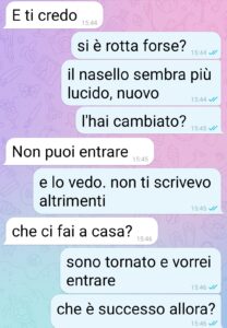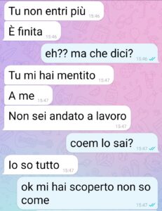 Allora signori di spunte, io sono Piero e sono quel marito traditore che sicuramente si sarà preso le peggiori offese del mondo in qualche chat precedente. Non ho nemmeno la forza di cercarla questa chat. Quella che vi ha mandato mia moglie mentre cambiava la serratura di casa… ma è una storia monca! Questa è la parte che fa vedere come stanno le cose. Dategli lo stesso titolo e pubblicatela! Chiamatela l’altra campana come sottotitolo.. non so… ma fate sapere a tutti quale è la verità. Quuella foto ho sbagliato a mandarla a lei, ma era per mio padre. Non per l’amante! Mi doveva aiutare a portare a casa un’auto per Costanza. Non volevo che continuasse ad alzarsi alle 6 per prendere 3 autobus per arrivare in ufficio, dopo che le avevano rubato quella Fiat Idea che tanto amava. E invece sono un traditore senza prove!”