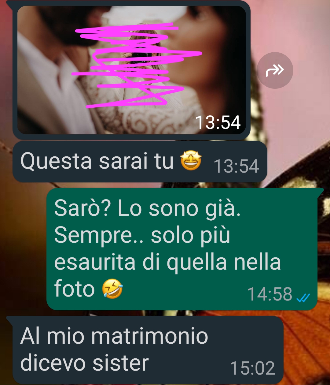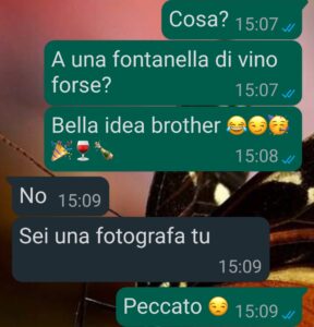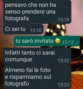 “Ciao a tutta la famiglia di Spunte blu, mi chiamo Eleonora e a giugno sarei dovuta andare al matrimonio di mio fratello Filippo, detto Pippo per simpatia, ma a quanto pare non ci andrò più. Per volere suo e per il fatto che questa volta ha tappato alla grande con me.. Uno strafalcione come questo da lui non me lo aspettavo, ho capito cosa pensa di me e soprattutto non pensavo fosse diventato una persona del genere. Nella vita faccio la fotografa, come potrete subito capire, e sono parecchio richiesta, non per vantarmi, ma negli anni sono riuscita a crearmi un bel giro di clienti, investendo anche molto sulla mia pubblicità. Lavoro molto, mi piace quello che faccio, ma non è proprio una passeggiata. I matrimoni sono il mio pane quotidiano, ma a quello di mio fratello avrei voluto essere semplicemente la sorella dello sposo, un’invitata…Invece lui aveva altri piani, ma è stato il modo in cui me lo ha comunicato che mi ha ferita molto.. In più, il dolore di non partecipare al matrimonio di un fratello è grandissimo…”