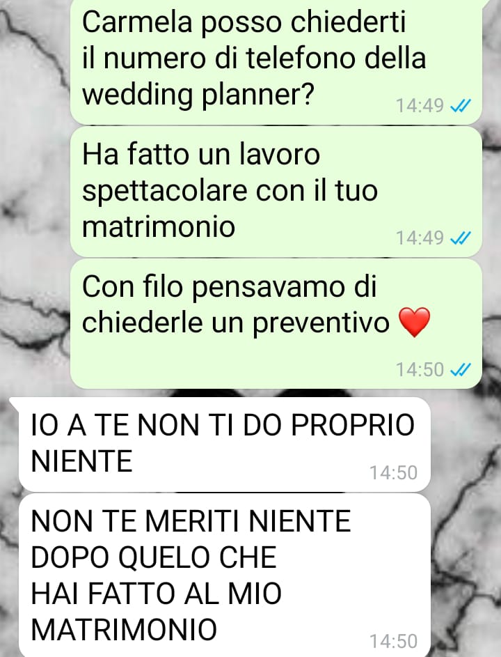 Premetto che io e Carmela ci conosciamo da 7 anni, da quando ho cominciato a uscire nella comitiva di un’amica che abbiamo in comune. Carmela si è appena sposata e con onestà dico che il suo matrimonio è stato organizzato egregiamente. Tutto era ben disposto, addobbi bellissimi e organizzazione perfetta. Ecco perché alcuni giorni dopo le ho chiesto il numero della wedding planner che l’ha seguita.