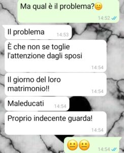 “Ciao spunteblu, ho voluto mandarvi questa chat perché penso che sia un insulto all’amicizia. Devo ancora capire se sia più giusto ridere o incazzarsi, ma forse la mia maturità di persona adulta mi fa provare solo pietà per le persone che si atteggiano così, come se il mondo girasse solo intorno a loro.
