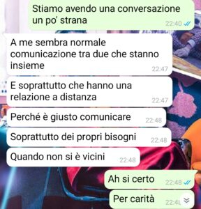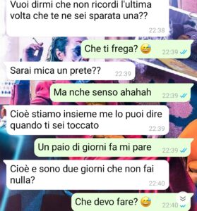 “Allora, io non so come dovrei iniziare questa cosa, a raccontarvi come mi ha trattato la mia ragazza, cosa mi ha fatto e cosa mi ha detto. Vorrei semplicemente farvi leggere la chat e sprofondare, ma penso sia giusto darvi un po’ di contesto, anche perché poi sembra, da come scrive lei, che io sia la ragazza e lei il ragazzo. Non voglio parlare per stereotipi, ma è vero che sono i ragazzi quelli che sono più infoiati, per non dire altro, e le ragazze più tranquille da questo punto di vista, e invece questa volta è l’esatto opposto. Io e lei ci siamo conosciuti un anno fa e ci siamo visti fin troppe poche volte. Questo perché abbiamo una relazione a distanza e non una di quelle iniziate da vicino e poi diventata a distanza, ma io e lei siamo di due regioni diverse, e anche molto lontane tra loro. Uno direbbe perché iniziare una relazione del genere, ma quando inizia a esserci quel qualcosa è difficile ragionare razionalmente. Purtroppo a causa del suo lavoro e dei miei studi non possiamo vederci spesso, ma ogni volta che ci è possibile io vado da lei o il contrario e stiamo insieme pure per mezzo mese. Dall’ultima volta è passato un mesetto ormai e lei mi ha cercato per dare inizio a una conversazione folle.”