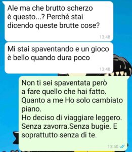 La chat è avvenuta una settimana fa, il giorno in cui avevamo l’aereo. Dovevo passare a prenderla e doveva avere inizio il nostro primo viaggio all’estero. Ma poi mi ha scritto una persona per dirmi una cosa che non mi aspettavo. E ho scoperto che quando smetti di rincorrere chi non ti merita, inizia il vero viaggio.