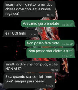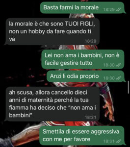 Vi lascio gli screen dell’ultima discussione, dove abbiamo toccato un punto di non ritorno. E sono stanco delle donne che incastrano noi uomini con questa scusa dei figli. BASTA!