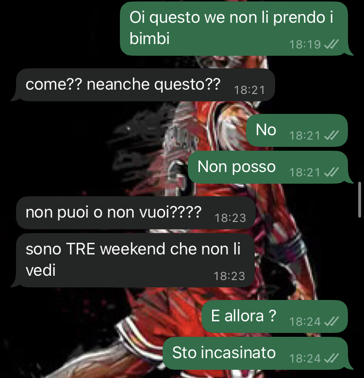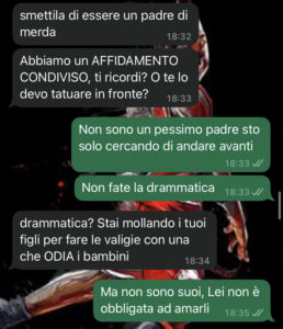 Vi lascio gli screen dell’ultima discussione, dove abbiamo toccato un punto di non ritorno. E sono stanco delle donne che incastrano noi uomini con questa scusa dei figli. BASTA!