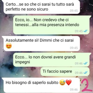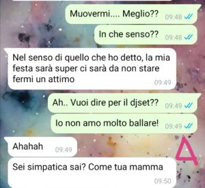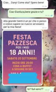 Bene, l’altro giorno appunto ricevo un messaggio da parte sua, nel quale mi chiede se sarei riuscita ad esserci per la sua festa. E mi manda la locandina digitale della festa.