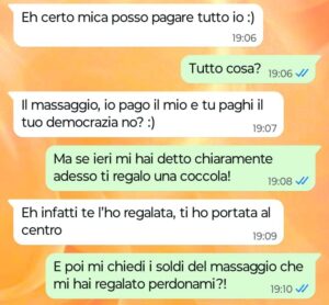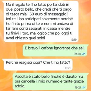 “Ciao Spunte Blu sono una ragazza come tante iscritta in una di queste app di incontri che testimonio in prima persona non funzionano e secondo me non hanno mai funzionato per nessuno. Su queste app ci sto da qualche anno ormai e vi giuro me ne sono successe delle belle ma quella che mi è successa stasera penso che le batta un po’ tutte. Vi invio una chat con l’ultimo tizio fulminato con cui sono uscita giusto tre volte in croce.. leggete un po’ cosa è accaduto alla nostra terza uscita e che messaggi da vomito mi ha scritto questo ragazzo poco fa. È normale? Assolutamente no per me e penso per nessuno dotato di materia grigia, bah sempre delusioni su delusioni…”