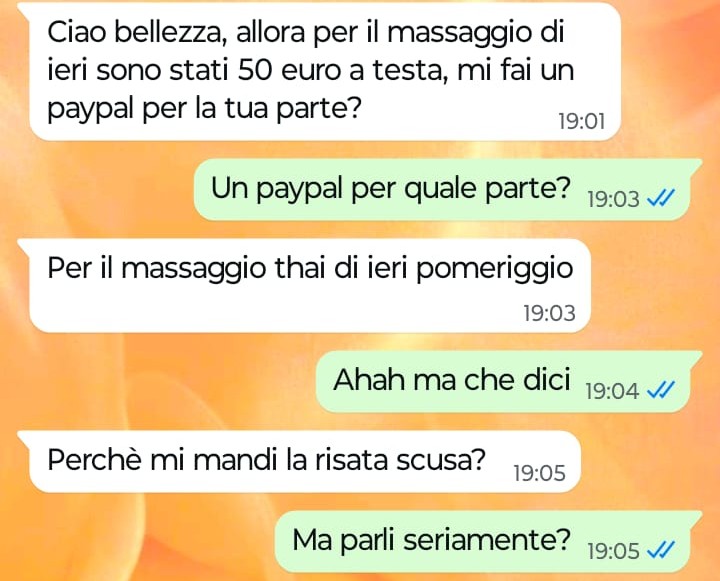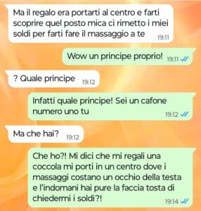 “Ciao Spunte Blu sono una ragazza come tante iscritta in una di queste app di incontri che testimonio in prima persona non funzionano e secondo me non hanno mai funzionato per nessuno. Su queste app ci sto da qualche anno ormai e vi giuro me ne sono successe delle belle ma quella che mi è successa stasera penso che le batta un po’ tutte. Vi invio una chat con l’ultimo tizio fulminato con cui sono uscita giusto tre volte in croce.. leggete un po’ cosa è accaduto alla nostra terza uscita e che messaggi da vomito mi ha scritto questo ragazzo poco fa. È normale? Assolutamente no per me e penso per nessuno dotato di materia grigia, bah sempre delusioni su delusioni…”