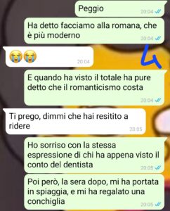Eppure, in mezzo a tutti i disastri, ha avuto anche i suoi momenti carini: una conchiglia trovata sulla spiaggia, una risata stupida mentre cercava di spiegare al cameriere che “il vino era troppo trasparente”.