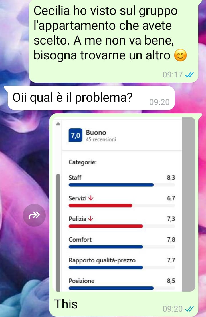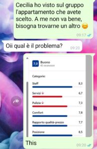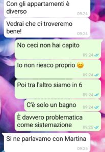 La pietra dello scandalo è proprio l’appartamento che hanno prenotato “a risparmio”, per così dire. Dopo diverse soluzioni avanzate, che non sono minimamente state calcolate da Cecilia, mi sono ritrovata costretta a prendere una decisione un po’ amara. Il fatto è che ora mi hanno tolto la parola e non so assolutamente come affrontare la vacanza. Ecco perché vi ho scritto, perché ho bisogno che anche voi facciate capire a Cecilia che non sono io a stare dalla parte del torto e che quando si tratta di vacanza, deve esserlo per tutti.”