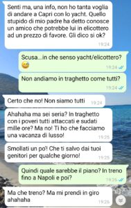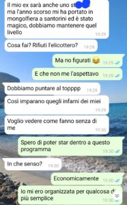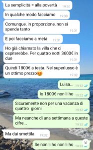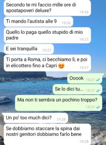 “Io e Luisa ci conosciamo dai tempi del liceo. Eravamo quelle che si passavano i bigliettini durante l’interrogazione di storia e che il sabato pomeriggio andavano insieme a provare trucchi nei centri commerciali “per gioco”. Poi la vita ha fatto il suo corso: io ho iniziato a lavorare subito dopo l’università, lei invece… ha continuato a essere “figlia di”. Di papà, in particolare, ma spesso anche di altro…E no, non è una frase fatta: parliamo di una persona che ha uno yacht, due case all’estero e un autista. Negli anni ci siamo un po’ perse, perché il suo mondo sembrava sempre più lontano dal mio. Ma ogni tanto ci risentiamo, come se bastasse una chat per cancellare tutto il tempo passato a non capirsi più. Il problema è che Luisa è rimasta bloccata in un universo tutto suo, fatto di elicotteri, spa, brunch da 50 euro a persona e zero consapevolezza. Ma la cosa peggiore non è nemmeno quello che fa: è come lo racconta, sempre con quell’aria da “voi poveri mortali non potete capire”. E infatti, non capisce. Eravamo d’accordo, dopo anni, di rifare una vacanza insieme, poi la situazione è degenerata.”