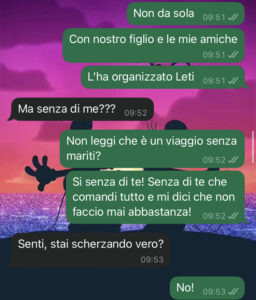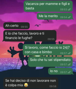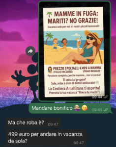 “Ciao a tutti voi della pagina… Sono una mamma e una casalinga a tempo pieno da ben cinque anni. Ieri una mia amica, mamma anche lei di due meraviglie, mi ha girato questa locandina. Ha organizzato una vacanza solo per mamme e figli, niente mariti! Che bello!