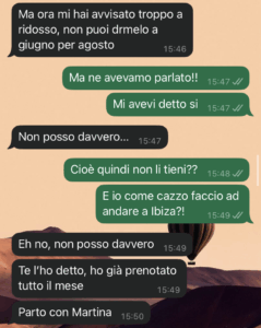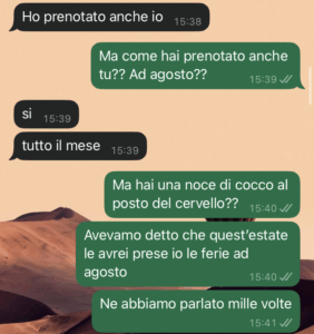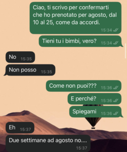 Riguarda le ferie di quest’anno… Lui vede i bambini davvero pochissimo, li tiene raramente a casa sua, accade solo qualche week-end ogni tanto. Gli avevo detto che quest’estate avrei voluto staccare un po’, perché ne ho davvero bisogno. Quando gliel’ho ricordato, non immaginerete mai cosa mi ha confessato….