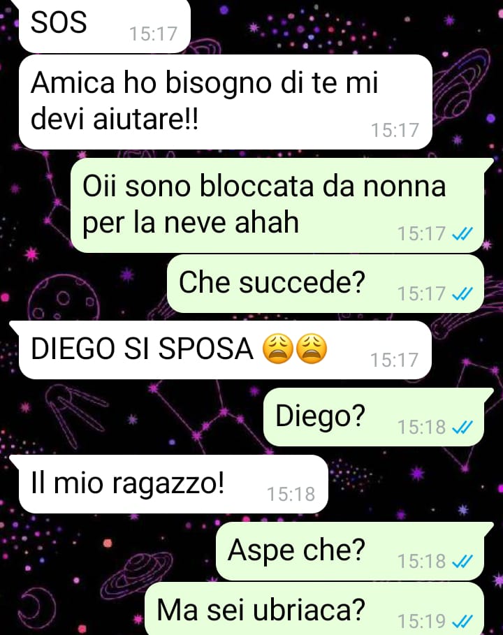 “Cari lettori di spunteblu, sono in crisi. Mai avrei pensato di mandare una chat alla pagina, ma una delle mie migliori amiche credo che sia impazzita all’improvviso. Dopo sette anni di amicizia, non posso certo negare che Denise è quell’amica del gruppo con cui ne succede sempre una: è impossibile non divertirsi con lei, perfino quando facciamo figure di merda in giro tra la gente.