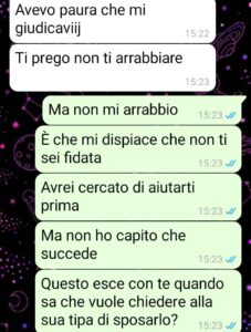 Poi, dal nulla, l’altro giorno mi scrive per dirmi che ha assoluto bisogno che io la aiuti a sistemare un problema con il suo ragazzo. Partiamo dal presupposto che io non sapevo assolutamente nulla di questa storia… il problema è che lei sta facendo una cosa sbagliatissima e mi ha messo in mezzo e mio fratello pretendendo una cosa da me che io non vorrei fare.