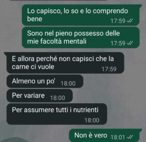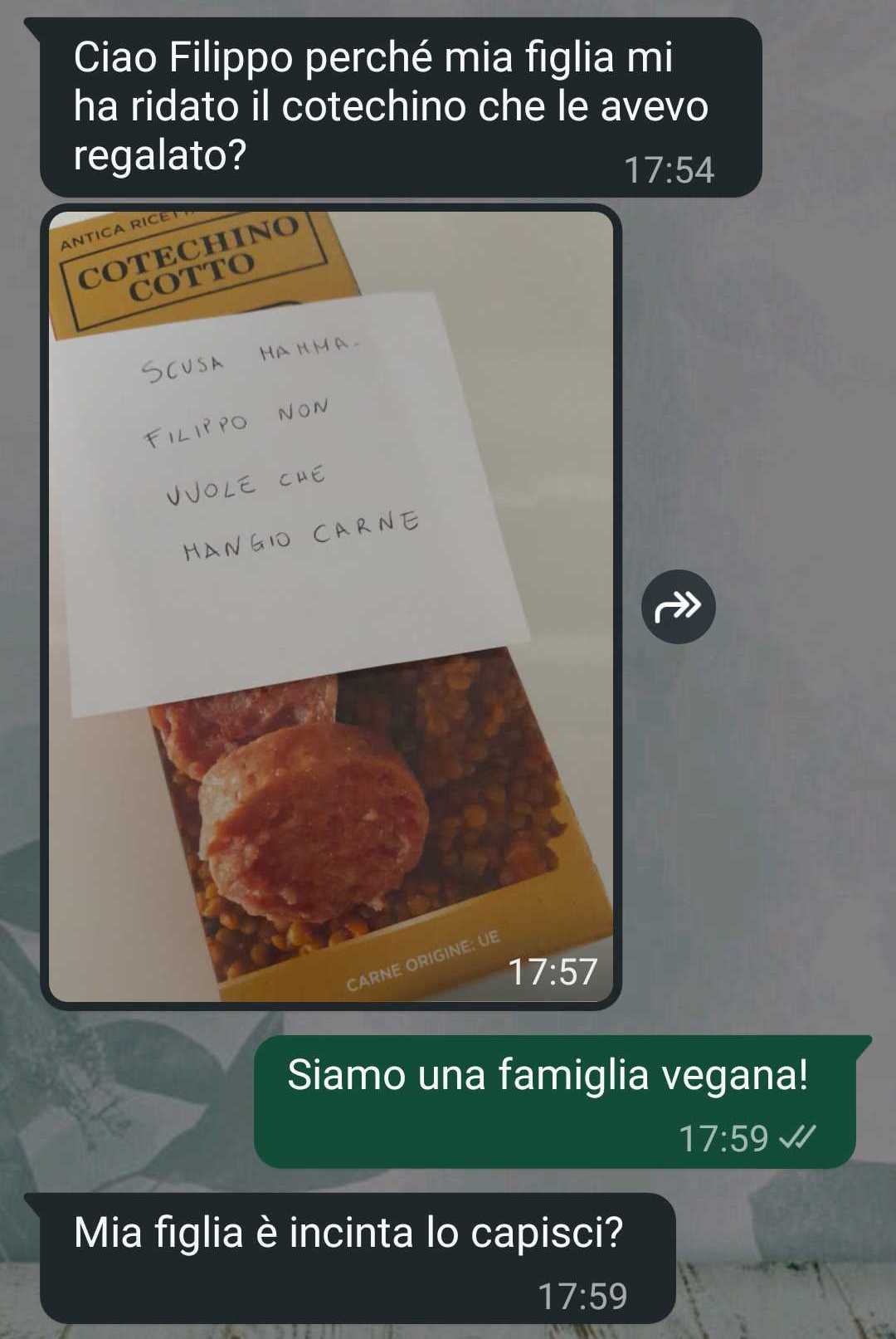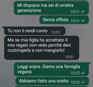 “Ciao spunte blu Mi chiamo Filippo. Io e mia moglie siamo una famiglia vegana e abbiamo fatto certe scelte. Ora mia moglie è incinta. E mi ha scritto mia suocera che mi ha veramente fatto sentire male.