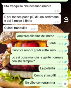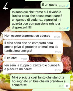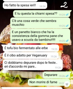 Mia moglie non è vegana – anzi: la grigliata è la sue religione – ma nel mese di gennaio – analisi del sangue in una mano e bilancia nell’altra – ci mette tutti e due a dieta ferrea, trasformandosi in una nazi vegana ossessionata dalle calorie. Niente carne, niente formaggi, niente grassi, niente alcool. Insomma: la parola d’ordine è NIENTE!