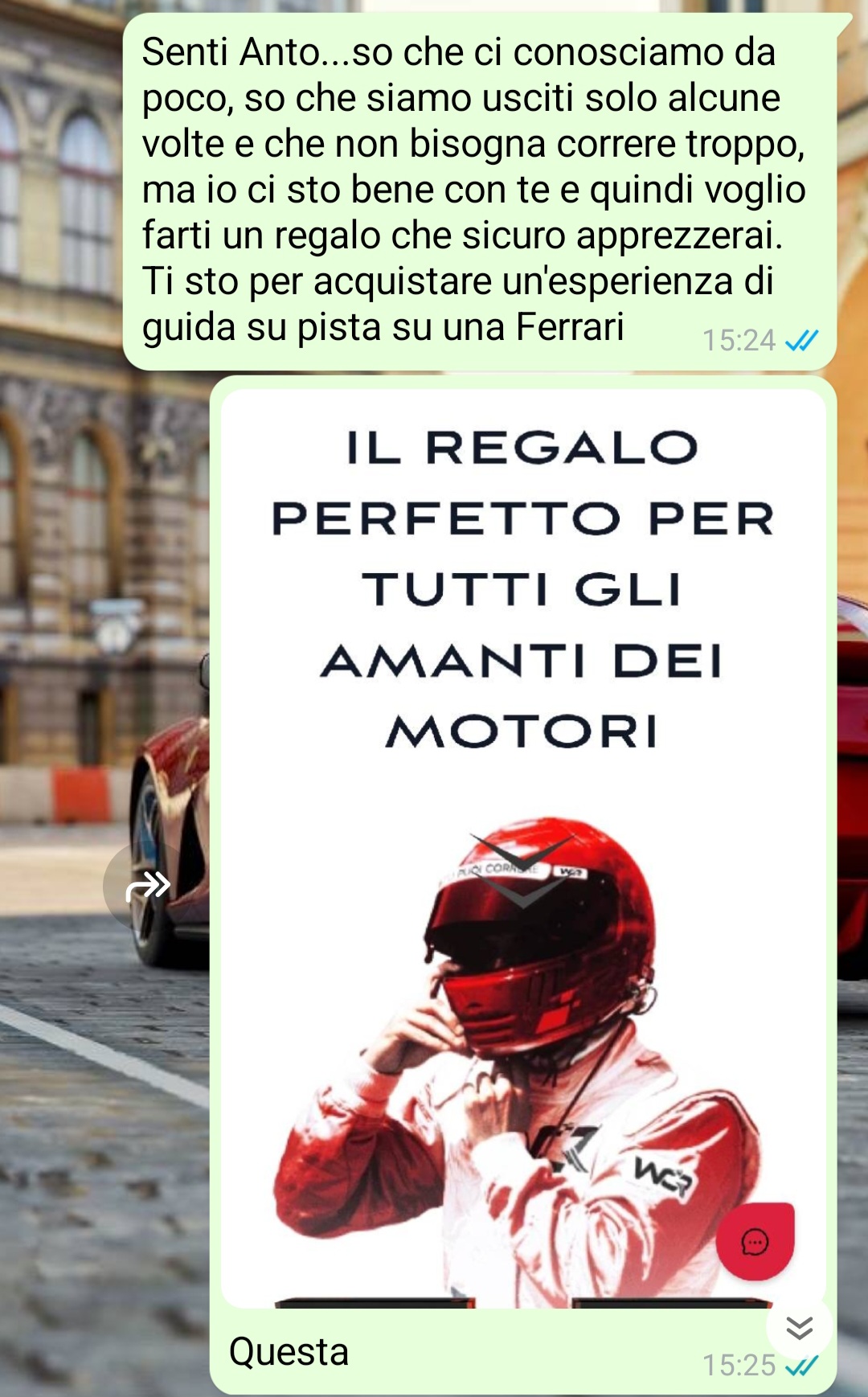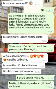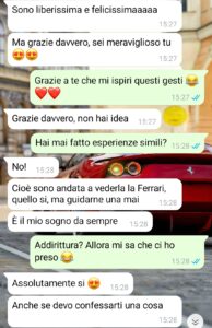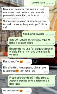 “Poteva finalmente essere una storia bella, una storia di quelle strappalacrime o comunque a lieto fine, dove l’amore trionfa, e invece no. Ne ho ricevute tante di delusioni, e l’ho sempre accettato perché, seppur con colpe comuni, ognuno ha sempre avuto le sue responsabilità. L’amore può finire, le coppie si possono spezzare così come anche i legami più forti, ma di fronte a motivazioni serie. E soprattutto con rispetto. Qui il rispetto non c’è mai stato e io sono furioso contro questa persona che, qui lo sottoscrivo, ha tutti i torti. Fatta questa premessa, poco tempo fa ho conosciuto questa Antonella tramite amici comuni e siamo usciti alcune volte. Mi piaceva e io piacevo a lei. Non stavamo ancora insieme ma piano piano, senza fretta, stavamo superando tutti gli step tipici all’inizio di una relazione. Il motivo del nostro grande feeling era la nostra passione in comune: i motori o, per essere più precisi, la Ferrari. Entrambi siamo fan assoluti della Ferrari e questo ci ha legato subito. Dato che ne avevo la possibilità, ho deciso di farle un regalo, un regalo che sicuramente avrebbe amato.”