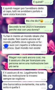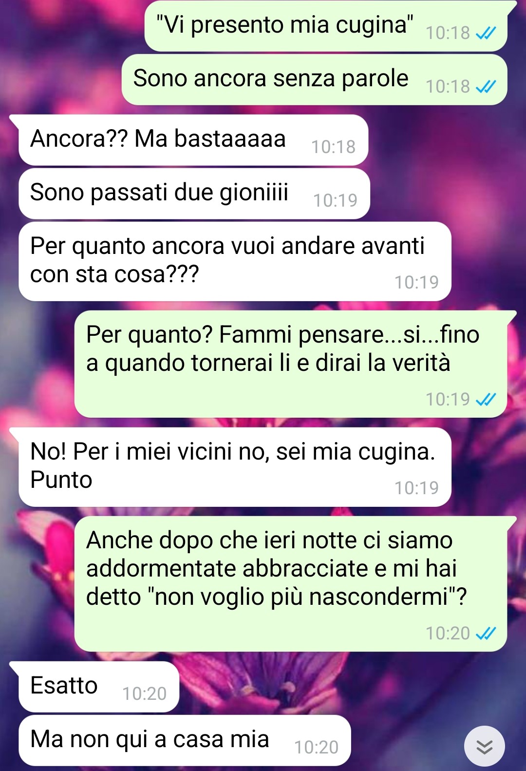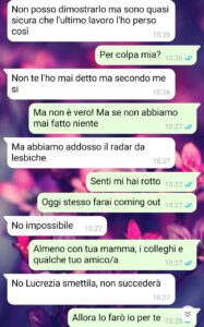 “Dopo tanto tempo, dopo tanta sofferenza accumulata riesco finalmente a fare la cosa giusta, a prendere io sulle spalle le decisioni che altri avrebbero dovuto prendere da tempo, e vengo anche accusata di violenza? No, non ci sto più, e questa chat dimostra che ho ragione. Non so se chi leggerà questa storia potrà capire fino in fondo cosa significhi amare qualcuno e doverlo, allo stesso tempo, nascondere. Io ci vivo dentro, ogni giorno. Quando ho conosciuto lei, non è stato il classico colpo di fulmine: è stato peggio. Peggio perché mi ha preso alla sprovvista, come un temporale d’agosto quando hai appena steso i panni. Era bellissima, ma soprattutto intelligente. Aveva quello sguardo che ti fa sentire vista, davvero vista, come se sapesse esattamente chi sei e dove ti fa male. Ci siamo innamorate piano, tra messaggi ironici, passeggiate rubate e caffè bevuti troppo in fretta per non dare nell’occhio. La verità è che io non ho mai avuto paura di amare una donna. Lei sì. E quindi abbiamo sempre vissuto nell’ombra ma io non ce la facevo più. L’altro giorno mi ha presentato come sua cugina, e questo è stato troppo per me.”