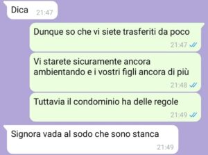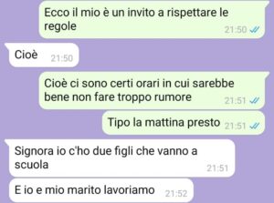 “Ciao a tutti, mi chiamo Eliana e vi scrivo per condividere con voi la conversazione che ho avuto recentemente con la mia vicina di casa. O meglio, con la nuova vicina, madre di quegli indemoniati che lei chiama figli e che hanno praticamente stravolto la pace del palazzo. E soprattutto la mia, l’inquilina del piano di sotto.