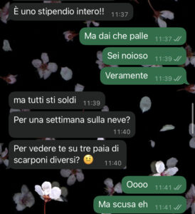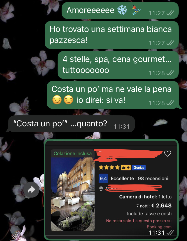 Gli ho proposto una piccola vacanza, una settimana bianca che desidero da tanti anni, niente di così folle nella mia testa… e invece la conversazione è degenerata in un modo che non mi aspettavo proprio! È stato un gran cafone!