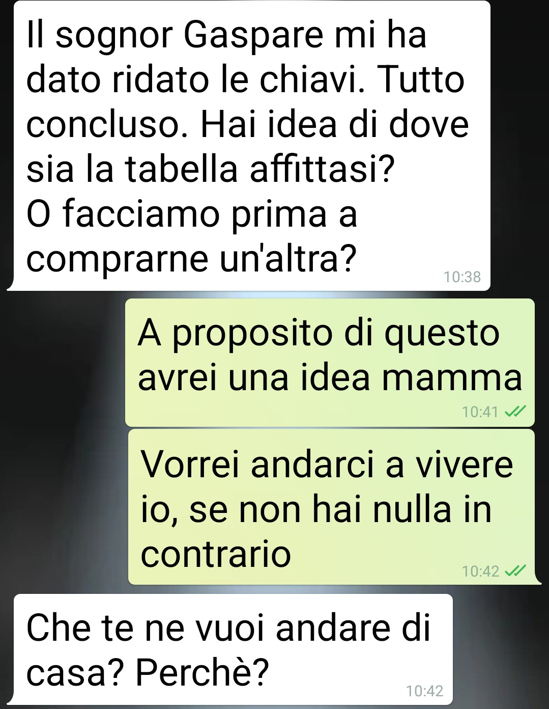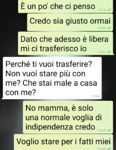 Ciao spunte, questa discussione l’ho avuta con mia mamma appena ieri. Ho colto l’occasione del fine contratto d’affitto dell’inquilino che stava nella sua  seconda casa, per comunicarle che voglio vivere da sola. Ho 38 anni, direi che non c’è niente di male in questo. Forse invece c’è nel non averlo fatto prima. E vorrei usare questo bilocale, perfetto per le mie esigenze e vicino a casa dove abitiamo insieme per adesso. L’ha presa malissimo. Un po’ me lo aspettavo, ma non che regredisse a livello infantile come leggerete. Mi ha avuta un po’ grandicella, aveva 36 anni. Sono l’unica figlia e mio babbo è morto quando avevo 3 anni. Non lo ricordo granché. Siamo sempre state io e lei, lei e io. E lo saremo comunque nella via visione. Mia mamma è speciale, mi hanno fatto tenerezza i suoi tentativi di tenermi sotto il suo tetto. Dovrei rinunciare al mio proposito?”