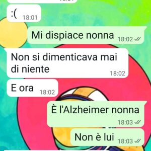 Mio nonno da qualche anno soffre di Alzheimer. All’inizio erano solo piccole dimenticanze, cose sceme, tipo non ricordarsi se qualcuno lo chiamava, non ricordarsi dove era, o la strada per andare da qualche parte. Poi pian piano i ricordi sono stati via via cancellati, come nel film Se mi lasci ti cancello. Un’ondata che attraversa il suo cervello e sciacqua via la memoria dai neuroni. Dannata sostanza amiloide!! =(. Io mi sono rassegnata, di me non si ricorda mai purtroppo già da un po’. sono un’estranea, a volte ladra, a volte figlia di qualche suo amico. Chissà come sceglie..