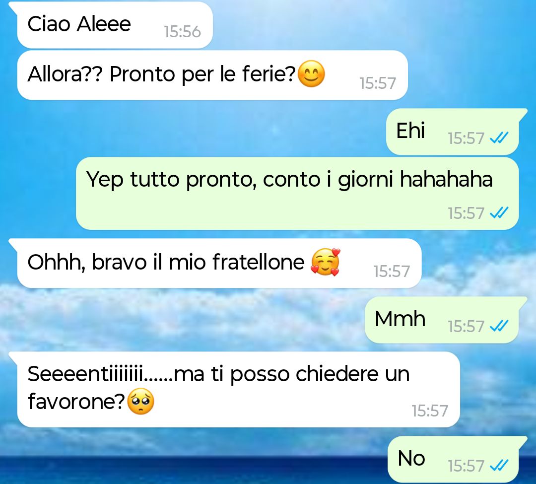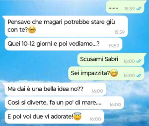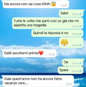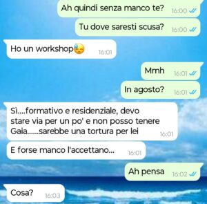 È madre single, vive da sola con Gaia, mia nipote di 7 anni. Una bambina splendida, sensibile, curiosa, intelligente. E stanca. Perché ogni anno, ogni estate, sua madre ha bisogno di “staccare”. E io, puntualmente, divento il piano B. O meglio: il piano A, ma senza mai essere consultato. Questa volta, però, Sabrina ha superato il limite. Due giorni prima della mia partenza, mi scrive chiedendomi di tenermi Gaia per due settimane. Dice che ha un “corso di formazione”. Mi puzza subito. Rapido controllo incrociato e mi rendo conto che dietro c’è ben altro, un piano degno di una ragazzina che finge corsi di recupero per andare a qualche concerto di nascosto, insomma. E ho deciso di non farle passare liscia questa ennesima presa in giro. Questa è la chat che ho avuto con lei…quest’anno, anche come zio chiudo per ferie!”